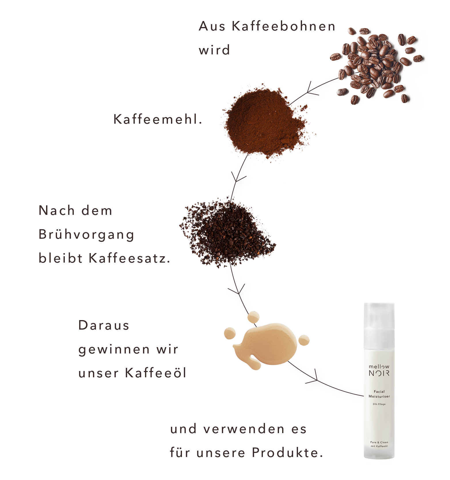 In einzigartigen Rezepturen vereinen wir eine sehr sorgfältige Auswahl purer und hochwirksamer Inhaltsstoffe. Die Schönheitsinnovation, aktives Kaffeeöl aus 100% verbrauchtem Kaffee wird in jedem unserer Produkte durch modernste Wirkstoffe veredelt.